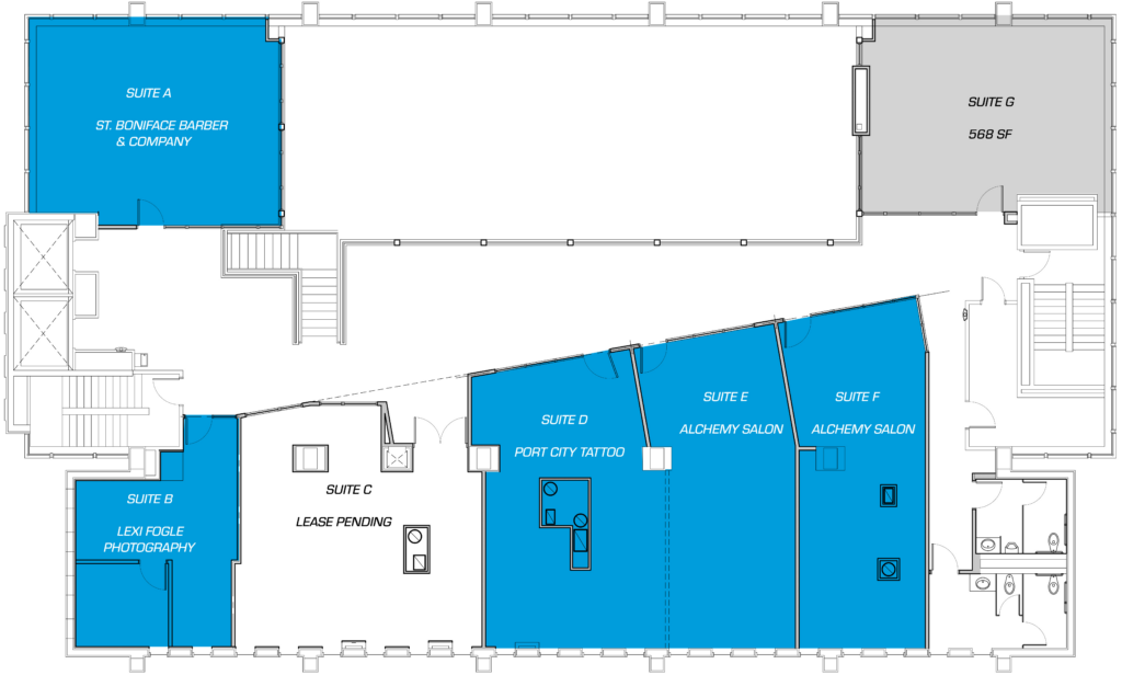 Core Plaza is home to St. Boniface Barbershop on the second floor retail level. Jed and his staff offer traditional, appointment-based services, focused on precision men’s cuts, straight-razor shaves, beard shaping, and classic grooming. The goal is to bring back the craftsmanship of barbering with the ability to accommodate today’s modern style. The barbershop has a modern vibe with vintage decor and furnishings, overlooking Core Plaza’s bar and lounge area.